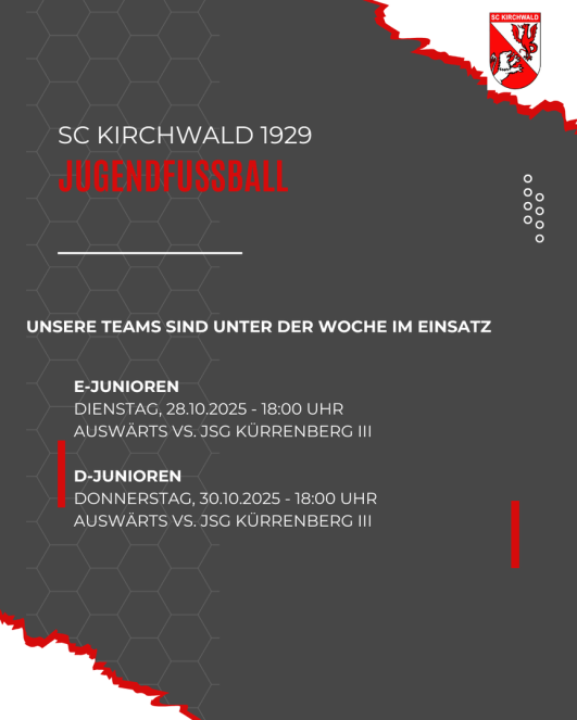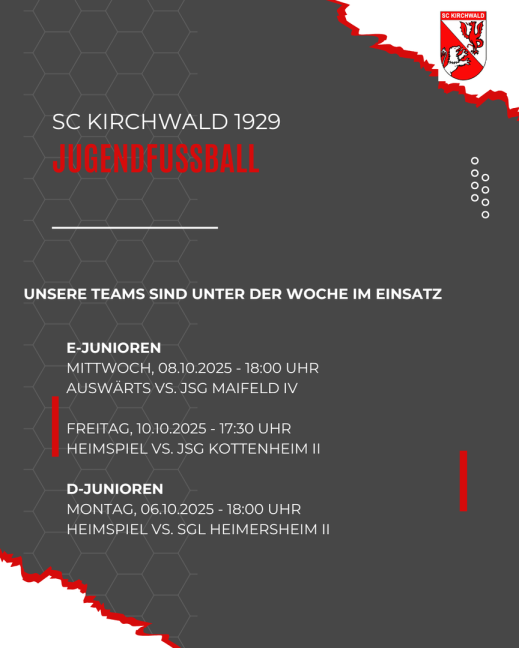 Während die F-Jugend sich schon in die Ferienpause verabschiedet, stehen für unsere E- und D-Junioren nochmal Spiele unter der Woche an. Den Auftakt macht die D-Jugend am Montagabend mit einem Heimspiel gegen die SGL aus Heimersheim. Die E-Junioren gastieren am Mittwoch in Mertloch und empfangen gleich zwei Tage später am Freitagabend die Gäste aus Kottenheim. Wir drücken die Daumen.